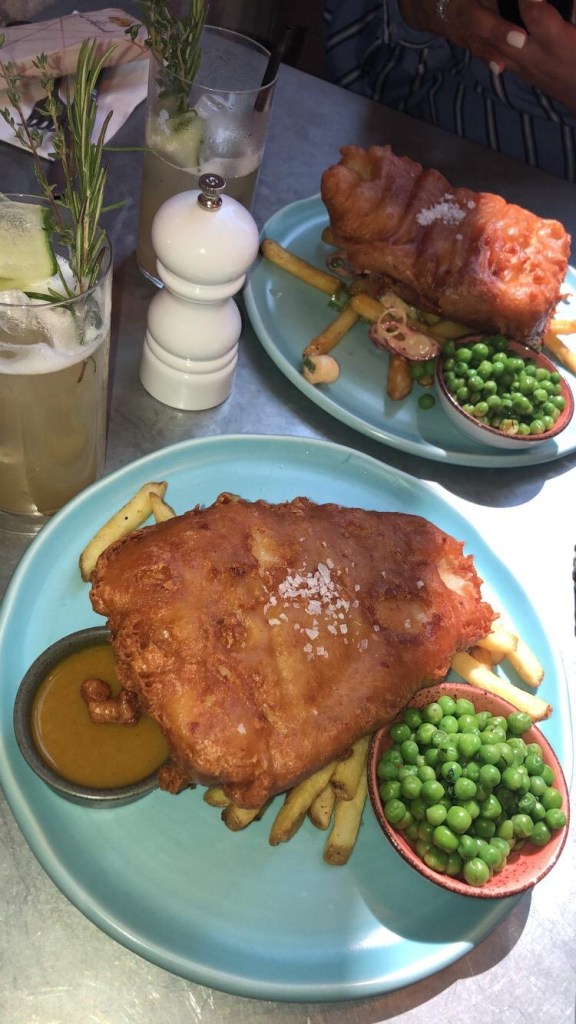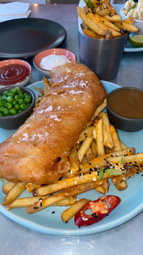- Battered fish served with sriracha fries, mushy peas and curry sauce