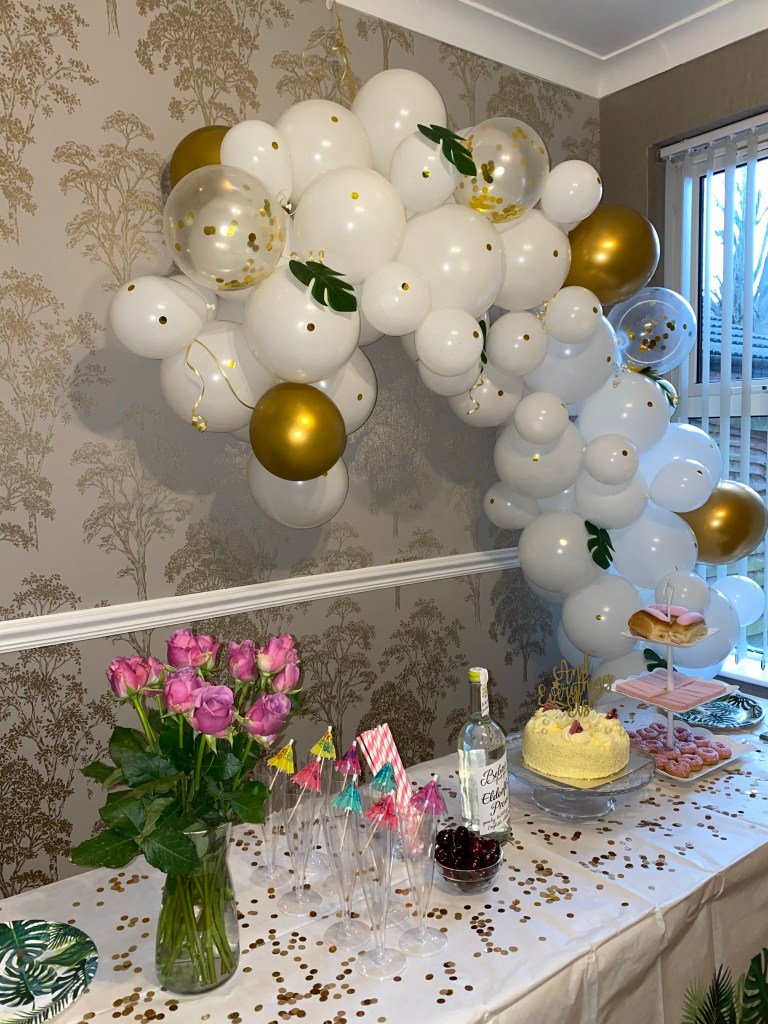 We did a dessert table as well as a balloon garland. The garland itself was a bit of a pain to assemble since I made the mistake of thinking I could blow 90+ balloons without a pump. I couldn’t but luckily I had my sisters to force into helping me. I actually planned the table around the garland so that’s where the white and palm leaf theme came from.