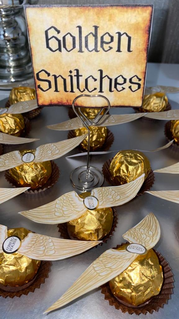 · Ferrero Rocher Golden Snitches – these look so great and are easy to make. All you need is cut-out paper wings which you then attach using the small name sticker on the chocolate. I found a template for the wings online which made things a lot easier, click here to check it out.