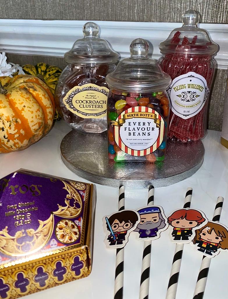 · Sweet Stand – we filled 3 jars with different sweets and added labels to make it look like the sweets from the movie e.g. Bertie Bott’s Every Flavoured Beans.
