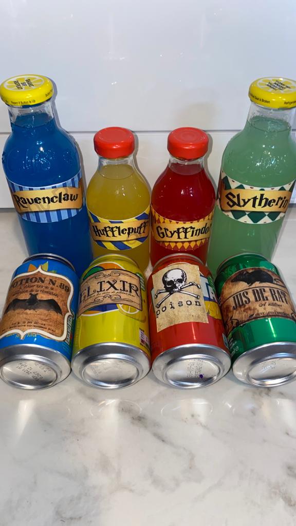 · Potion Drinks – we printed off labels with house names and potion names that we cut and stuck on cans and bottles. Surprisingly they turned out better than I had hoped!