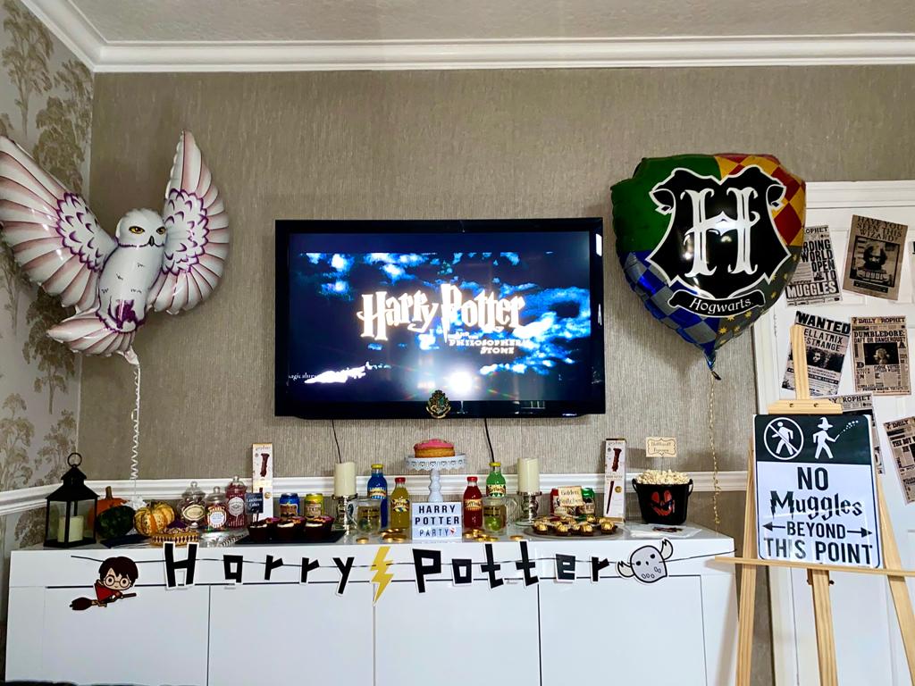 The main feature was the mini dessert table, which we set up under the TV with the decorations surrounding it. That way we could see it all whilst enjoying the movies! We had two large balloons framing the TV, one was a shield of the 4 Hogwarts’s Houses and the other was of Hedwig the owl. Is it just me or do balloons make everything better?! Anyway, both balloons were purchased from eBay and we got them blown up at our local party store.