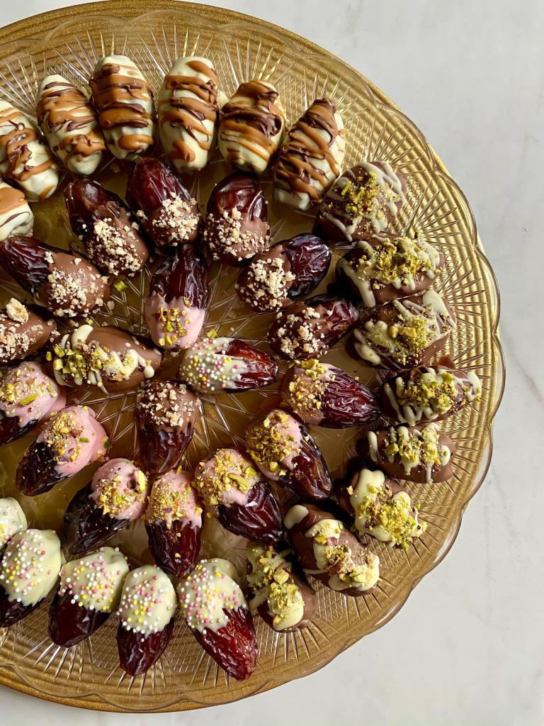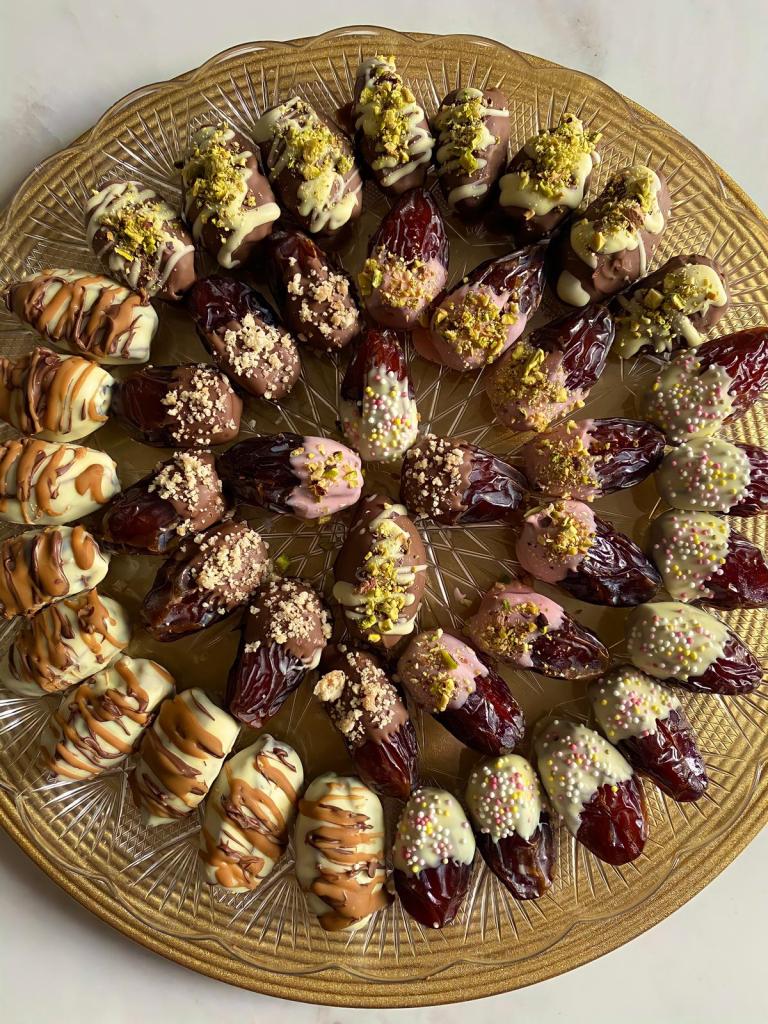 Medjool dates are the best to use for this since they are large in size and I find they’re taste best complements chocolate. The first step is to prep the dates by washing and de-seeding them, once you have done that you can fill it with the nut of your choice; I prefer to use almonds. After they have been filled comes the fun part; decorating! I used both milk and white chocolate to cover some of the dates completely and some of them partially. I also added a little food colouring to the white chocolate to have some pink ones. I then sprinkled them from a selection of pistachios, biscuit crumbs, rainbow sprinkles, nutella and biscoff drizzle. Last year I added cornflakes to the chocolate mixture to give the dates a crunchy chocolaty coating, which was also super yummy. You can pretty much use whatever so feel free to go wild!