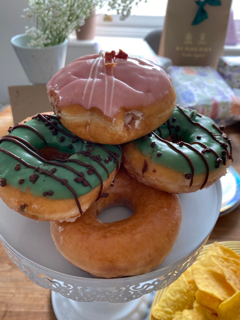 I love the look of piled doughnuts on a cake stand, we had 3 different flavours from Krispy Kreme, the original, mint choc-chip and the strawberries & cream. The strawberries and cream is my all time favourite as well as the original glazed but it was our first time trying the mint choc-chip and it was not nice at all even for a mint lover, so I would avoid it at all costs!