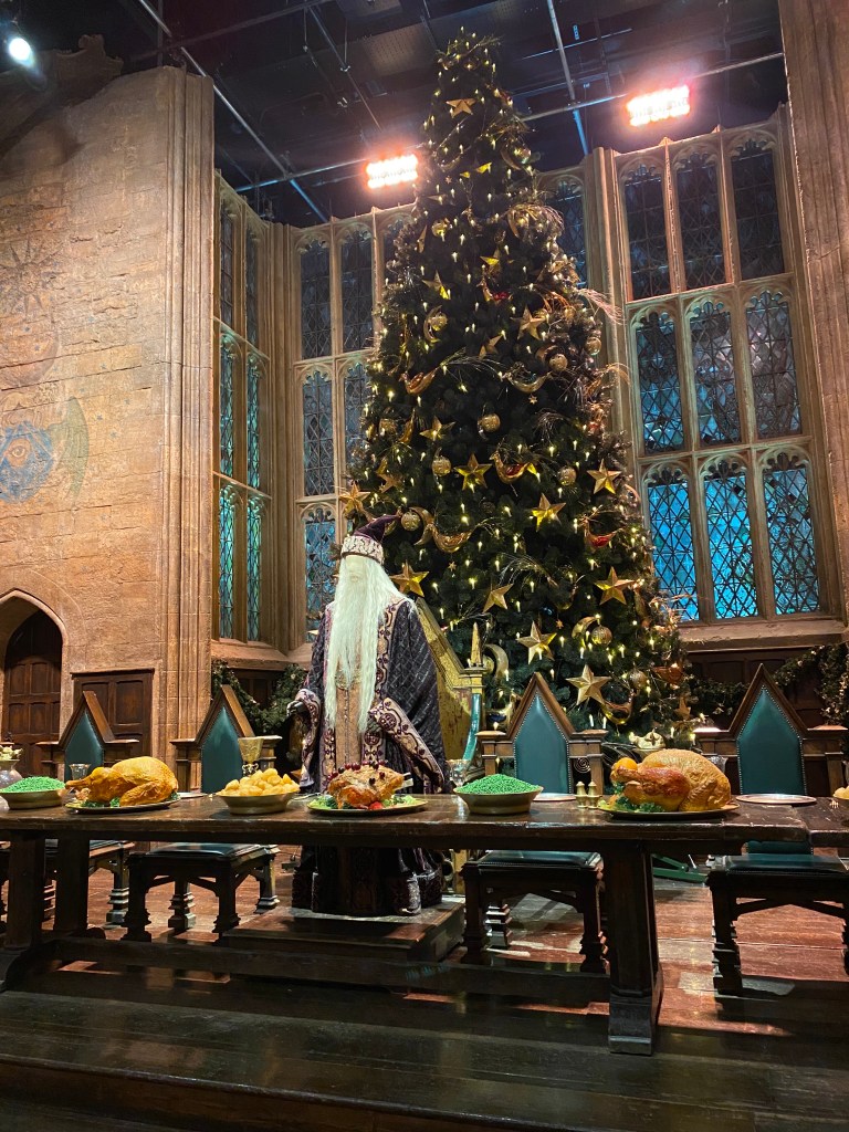 When you arrive at your allocated time slot you will be gathered as part of a group and then taken through introductions. Once you have been thoroughly informed the guide will usher you into the enchanting Great Hall which has been dressed for the occasion with wreaths, garlands and trees topped with witches on miniature broomsticks. The long dining tables are set as they were for the seasonal feast in Harry Potter and the Philosopher’s Stone, complete with Special Effects flaming Christmas puddings and prop versions of the mouth-watering roast turkeys and hams studded with cherries.