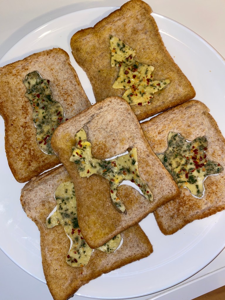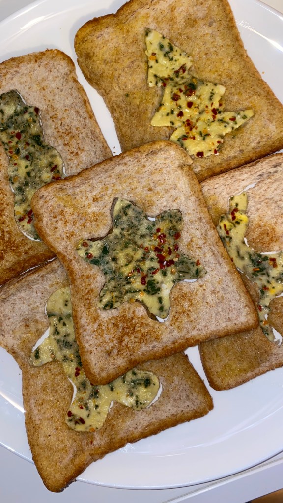 We started the day pretty late considering I had to cook a large meal for 6 but we managed. I made everyone a quick breakfast just to keep us all going considering dinner wasn’t served until 5pm. I had seen a picture of the above on Pinterest where toast had festive shapes cut out for egg to go in and I thought it was too cute to pass up. The process itself was pretty simple where you just: