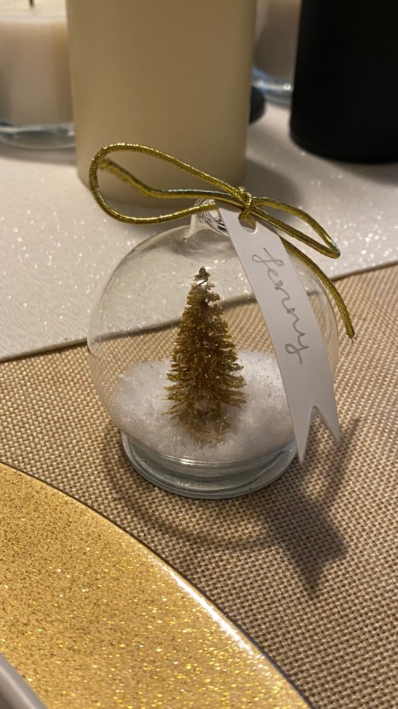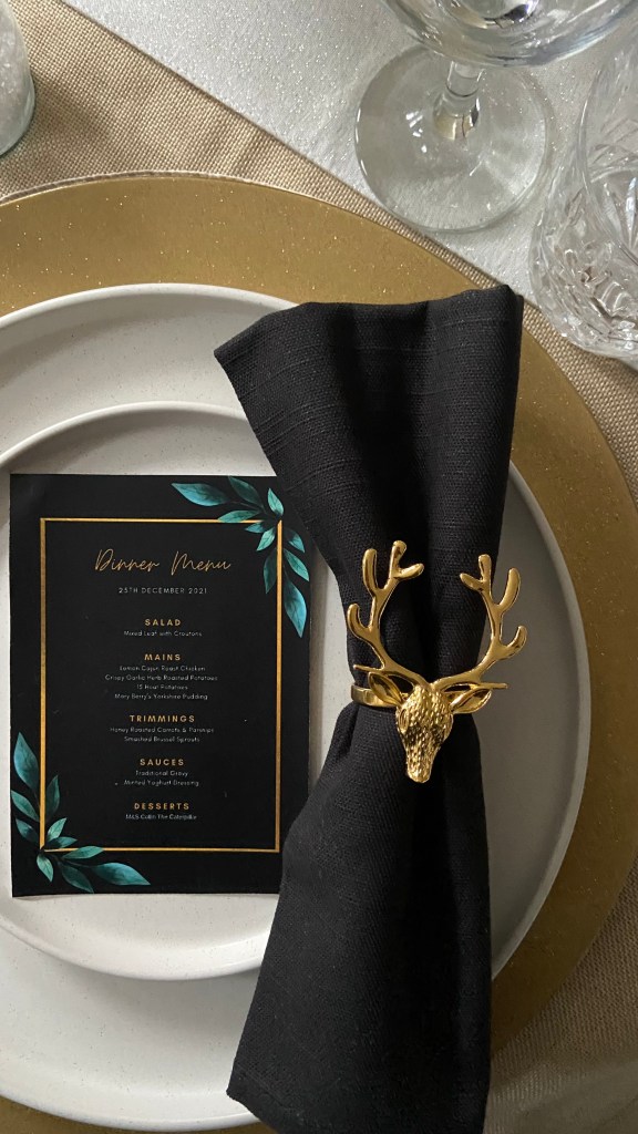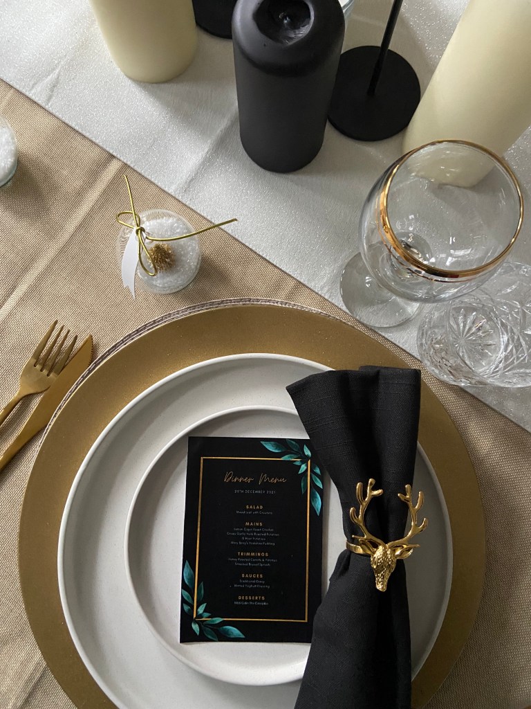 We printed off mini menus that followed the colour scheme for each person and used gold charger plates to make each place setting pop. My sister found the cutest little ornaments online to use as a place cards, these were from Ginger Ray off of Amazon and a huge hit everyone loved the little festive touch. We also found the most perfect napkin rings that were gold and shaped like a reindeer! We finished it off with gold cutlery and were blown away by the end result.