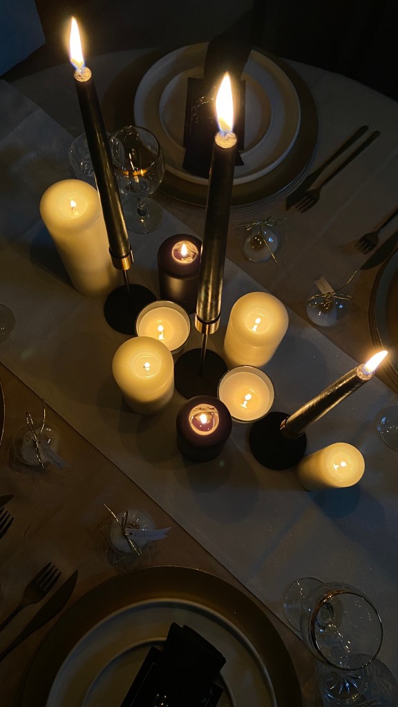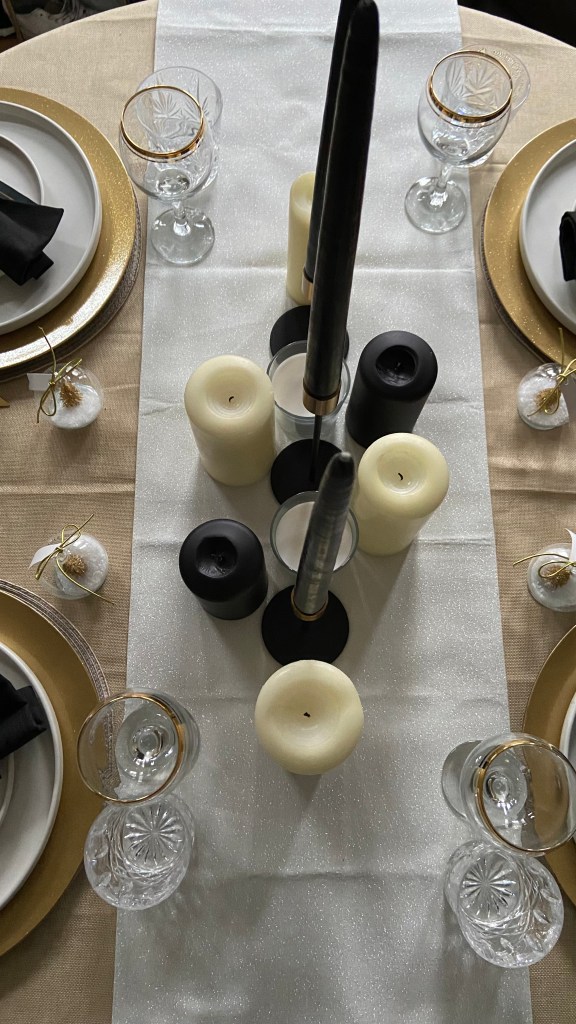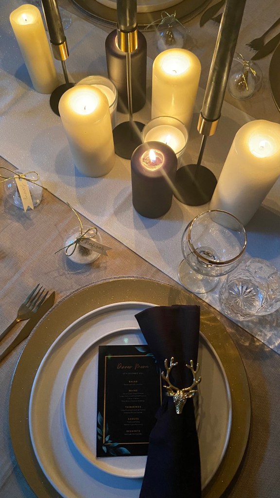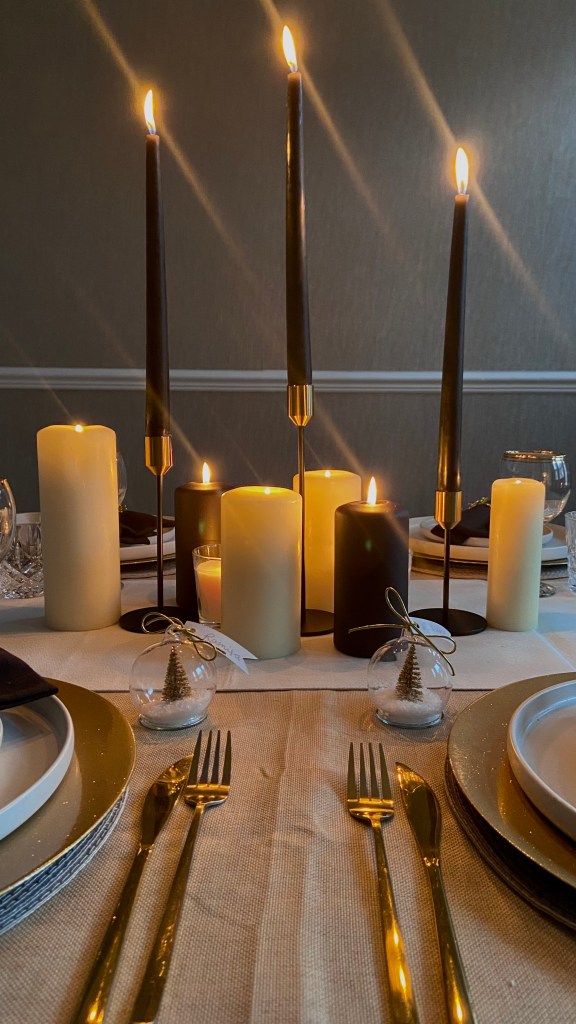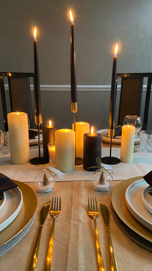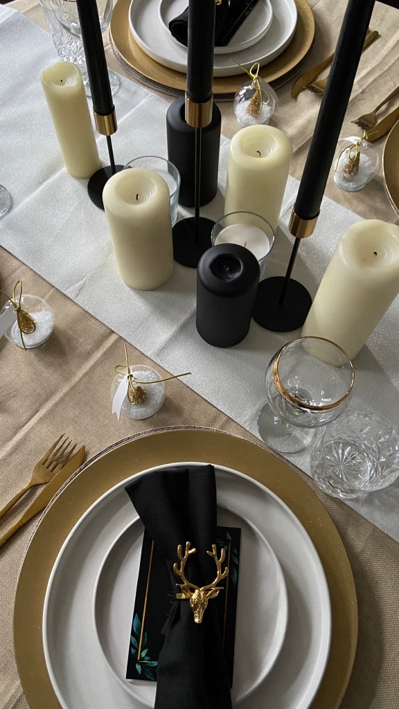 This year we decided not to eat at the dining room table but set up a circular table in the formal living room which we don’t use that often. The table setting we decided on was a lot more chic than what we have done in previous years. The theme was black, gold, white and nude. The main feature were the candles where we used a variety of colours, shapes and sizes to add dimension but also be the centrepiece of the table. The candle sticks were from amazon and the candles were from a range of stores – Ikea, H&M and Dunlem.