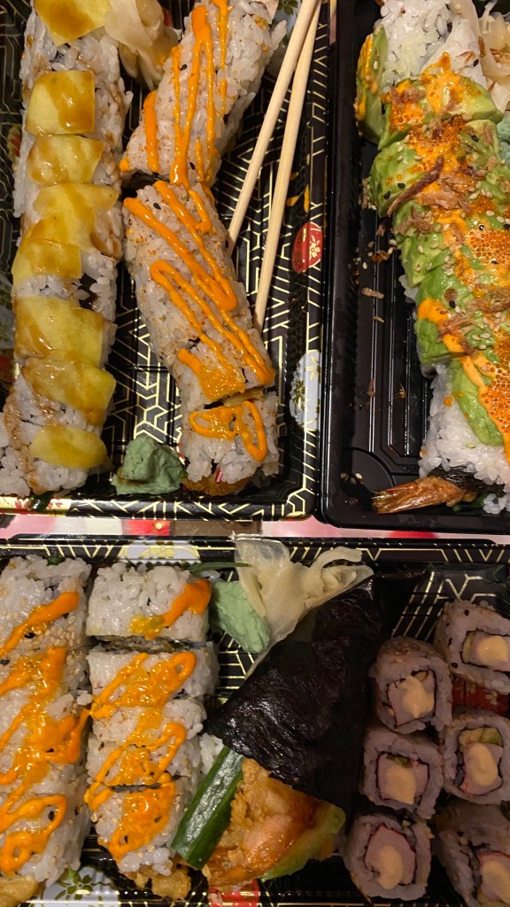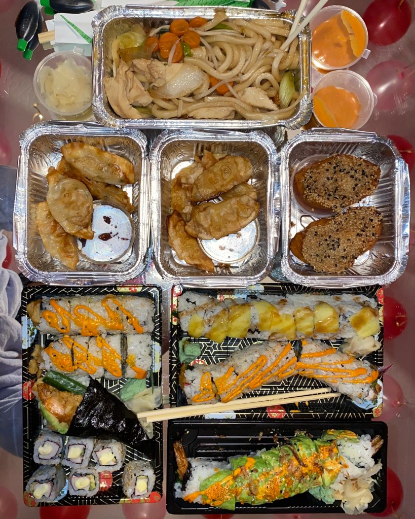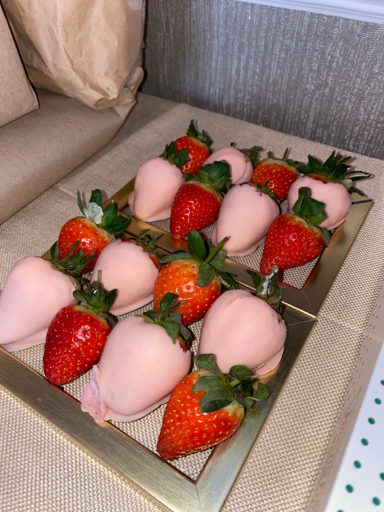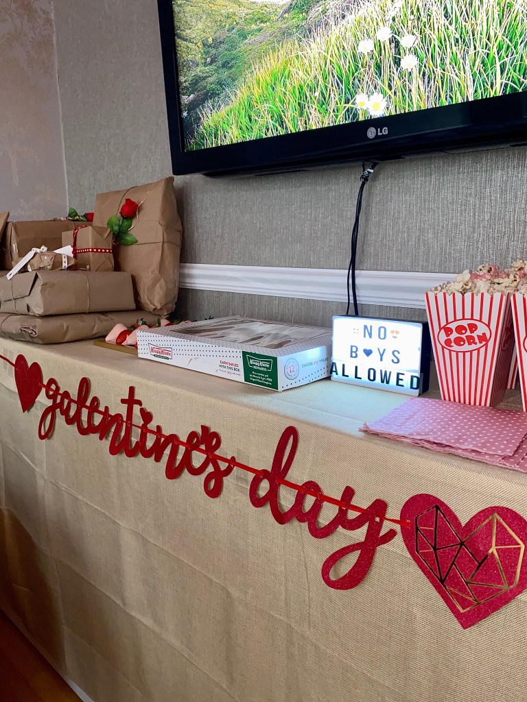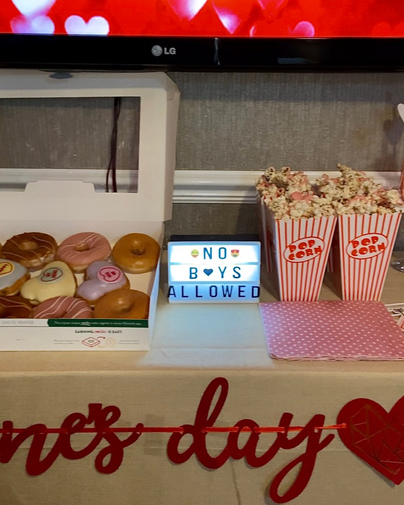 Food wise I kept it minimal since we were going to order sushi. I had decorated a small surface with our presents for each other, food and drinks. I put out chocolate strawberries which I made using white chocolate and pink food colouring, Krispy Kreme doughnuts, pink chocolate popcorn again and some non-alcoholic jelly shots. That kept us going throughout the day until we got the sushi and we grazed on the leftovers while watching a movie.