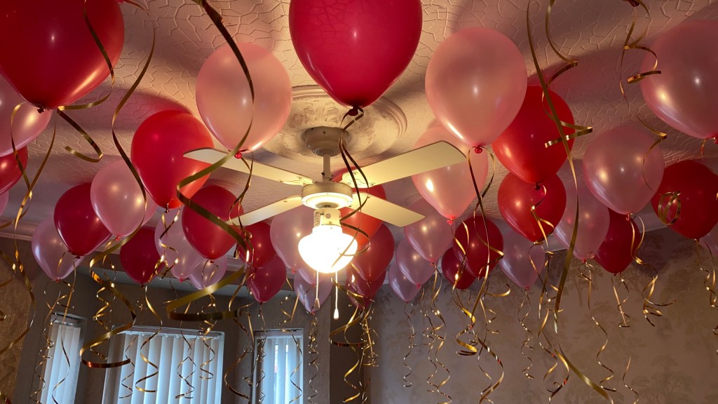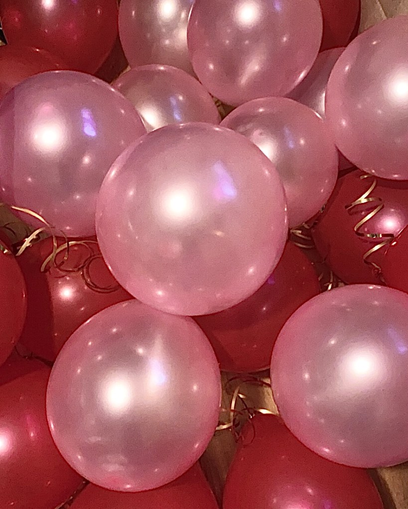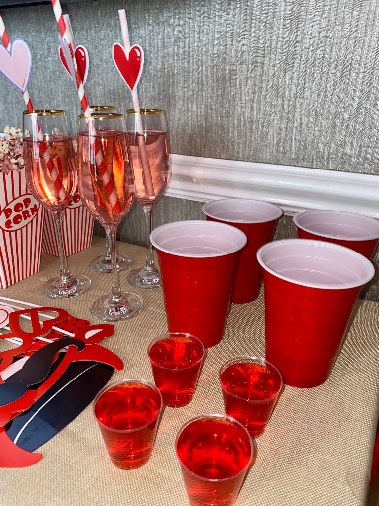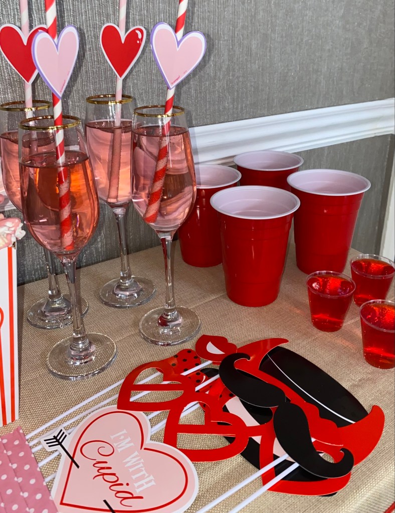 If there’s one thing to know about me, it’s the fact that I am a total sucker for balloons! So, any chance I get to insert balloons into the set up, I’m all about it! Anyway, I did a mixture of pink and red balloons on the ceiling with gold ribbon and it turned out super cute. Pro tip you can save money on helium by using glue dots to secure the balloons. This also makes the balloons last longer since they aren’t foil, they will deflate within a few hours if you use helium. I also had a cluster of foil heart balloons that came with stickers so we could put words or phrases on them. Those coupled with the gold streamers on the wall was a striking background to snap all those selfies!